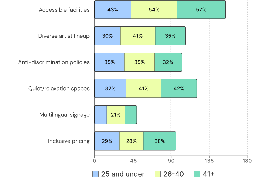 The 41+ age group again lead on accessibility concerns, with strong demand for accessible facilities (57%), relaxation spaces (42%), and inclusive pricing (38%).