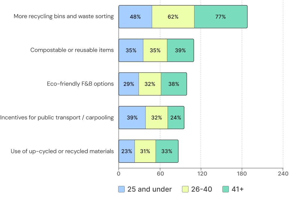 Expand recycling and waste sorting, offer compostable/reusable cups and plates, and have more eco-friendly food and drink options. Incentivizing public transport and carpooling particularly appeals to under-25s. It’s also important to effectively communicate about sustainability initiatives.